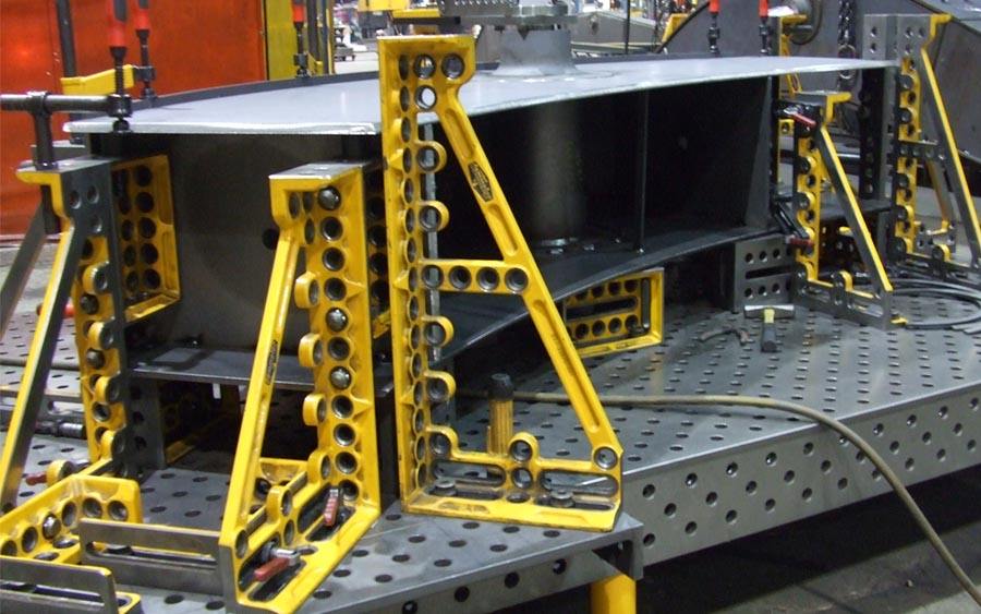 三維柔性焊接工裝平臺可以在三維空間進行組合。標準化、模塊化夾具系統在安裝、調整和夾緊工件中完美地體現了它的通用性功能,在大型工件的焊接上,該特點更加突出。柔性化的另一面體現在操作簡便,可以實現傻瓜式操作。在我公司工裝平臺和標準模塊上,所有以 12.5mm和25mm為倍數的尺寸均可直接找到,再配上少量的調整片,可以非常方便地準確定位。